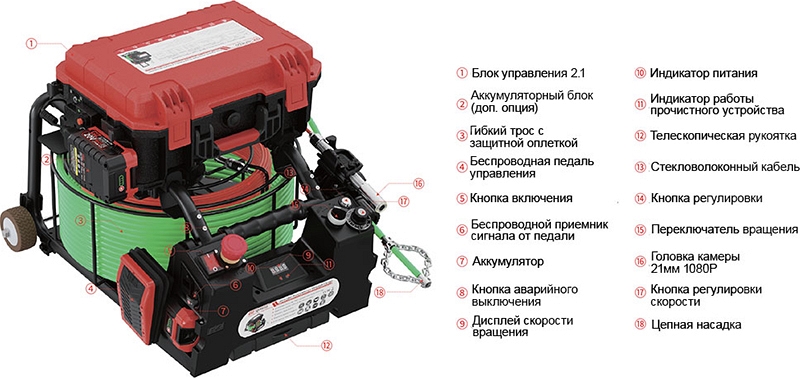 – Блок управления прочистным устройством: панель управления (дисплей скорости вращения прочистного троса, кнопка включения, кнопка аварийного выключения, переключатель вращения, кнопка регулировки скорости, индикатор питания, индикатор работы), встороенный литий-ионный аккумулятор, мотор, беспроводная педаль управления, беспроводной приемник сигнала от педали управления