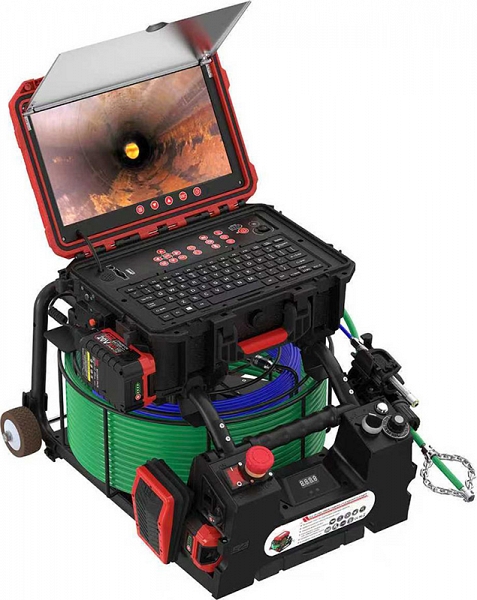 - Телеинспекционная система с функцией прочистки труб позволяет оператору одновременно и чистить трубы и проводить осмотр внутри труб