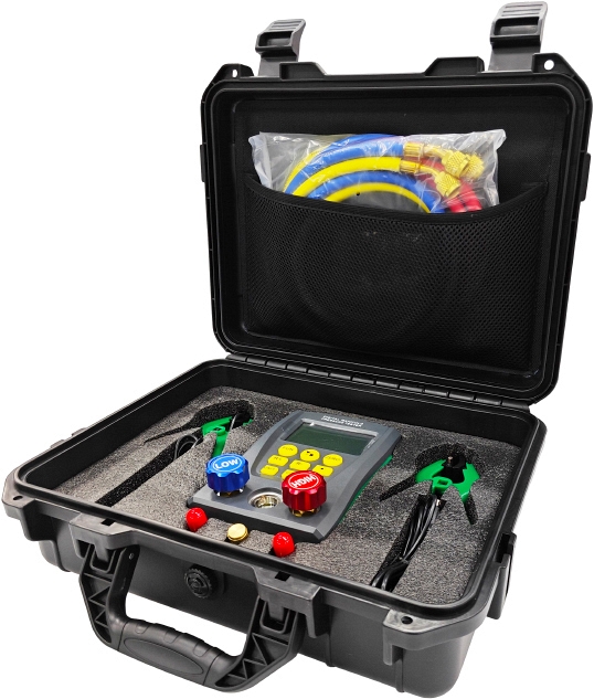 Цифровой манометрический коллектор со шлангами и клеммами в кейсе Voll V-100 Digital (Волл В-100 Диджитал) используется для измерения давления и температуры в системах кондиционирования, тепловых насосов и холодильного оборудования.